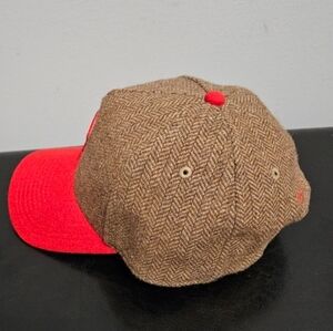 Stylish brown cap with a red brim and logo. Perfect for casual wear.