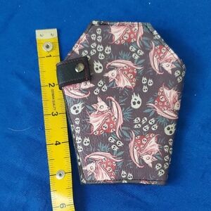 Unique coffin-shaped wallet featuring a gothic skull and bat pattern. Perfect for adding a touch of dark style to your accessories.