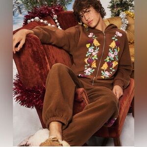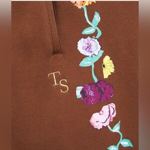 Website description: Brown sweatpants with side pockets and back pocket featuring acoustic piano flower design printed down both legs and "TS" logo embroidered in gold on wearer's left leg.