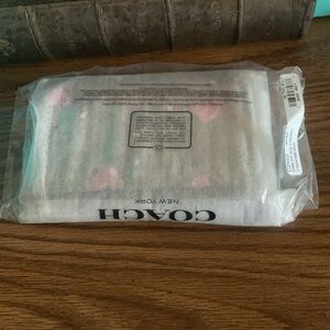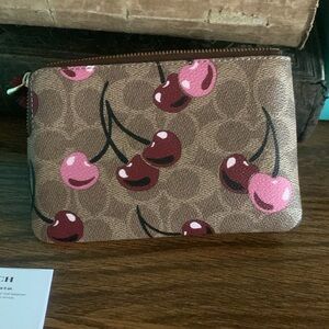 Stylish Coach wristlet with cherry print. Features brown background with pink cherries. Perfect for carrying essentials.