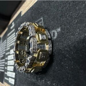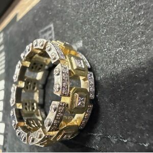 Elegant gold and silver ring with sparkling accents. Perfect for any occasion.