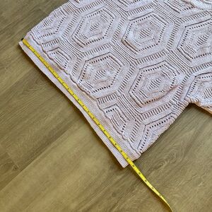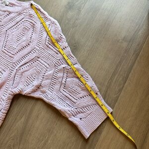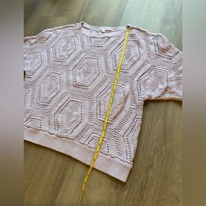 This item is a J. Jill open-knit pullover sweater featuring a distinctive hexagonal pattern, in a lilac/light purple color. It has 3/4 length dolman sleeves and a crew neck.