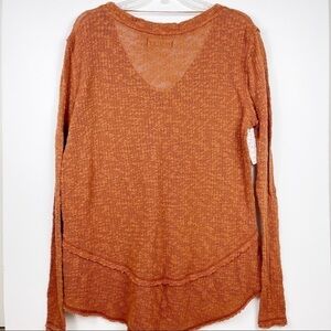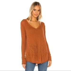 Free People “Ocean Air Hacci” – beautiful oversize cotton top in copper (brown orange) colour featuring V-neck, long sleeves, exposed seams, tiered raw hemline, light textured fabric. Great style, indeed!