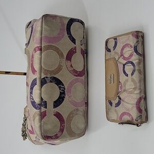 Stylish Coach tote with matching wallet. Features signature pattern in vibrant colors. Perfect for everyday use. Bag and wallet are preloved and in great used condition!