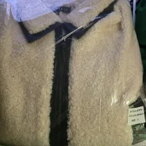 Chic teddy jacket with black sleeves and cream body. Perfect blend of style and comfort.