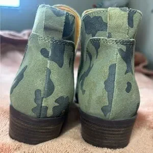 Lucky Brand camo ankle booties. Featuring a soft suede upper with an allover camouflage print, western-inspired silhouette, and a comfortable low stacked heel. Easy slip-on style with side cutouts makes them perfect for everyday wear.