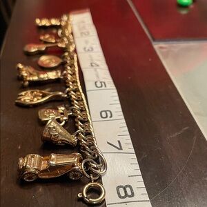 Vintage Gold charm bracelet featuring 9 unique charms (see photos) Perfect for adding a touch of fun and conversation to any setting. The style of this vintage charms bracelet goes with any outfit.