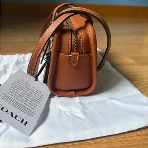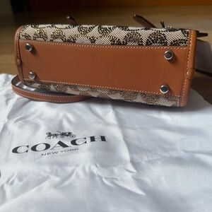 Elegant Coach handbag with iconic pattern. Rich brown and tan hues. Signature jacquard and glovetanned leather with fabric lining. Ideal for versatile styling.