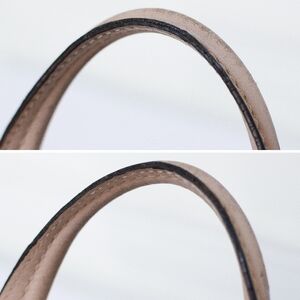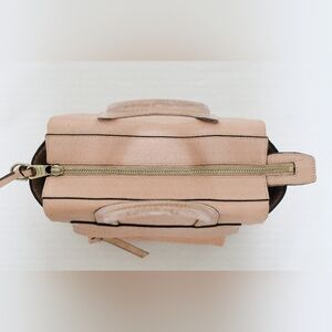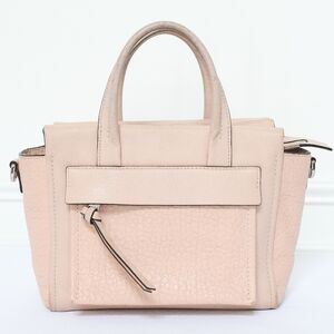 Light pink pebbled leather, mini, top handles, zip top, stamped hardware, exterior zip pocket, lined, interior pockets
