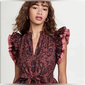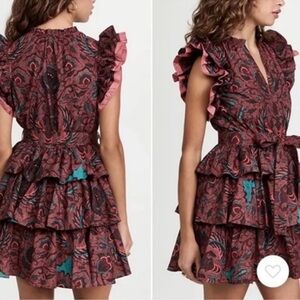 Ulla Johnson Red Teal Floral Tiered Ruffle Honoria Dress 6 Brown Belted Mini