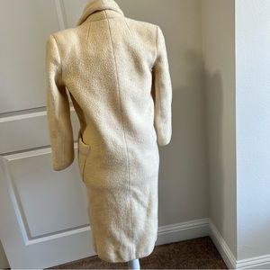 Step out in timeless style with this elegant vintage coat. Crafted in a warm, soft fabric, it features a double-breasted front with matching buttons and a structured, notched collar. The tailored silhouette hits around knee-length, offering a polished look perfect for both dressy occasions and everyday wear. A fully lined interior ensures comfort and quality, while the subtle ivory cream hue adds a unique, sophisticated touch to your outerwear collection.