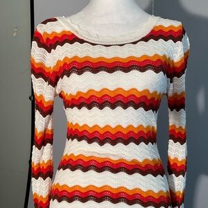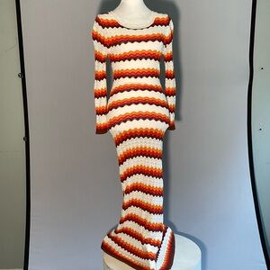 This Body-con form fitting, striped, long sleeve crocheted maxi dress, size small, with a deep scoop back is a head turner! Its vibrant stripes features a mix of red, orange, brown, and cream colors, perfect for Fall! It is soooo 70’s! It has no tags for fabric content or size, but it stretches to fit the body.