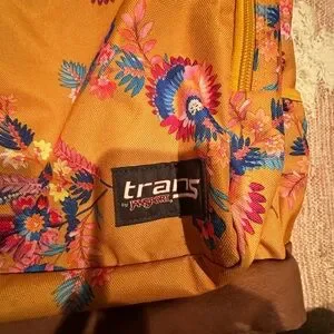 Stylish Jansport backpack with vibrant floral design. Features an orange base with colorful accents. Ideal for everyday use. Looks great