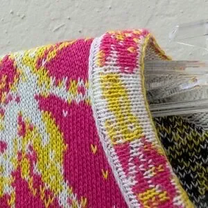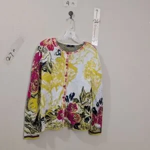 Vibrant floral button-up cardigan with pink, yellow, and black accents. Perfect for adding a pop of color to any outfit.