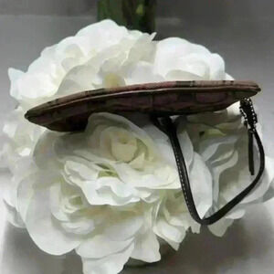 Coach Wristlet Signature Chocolate Brown Jacquard with leather strap and cording.
