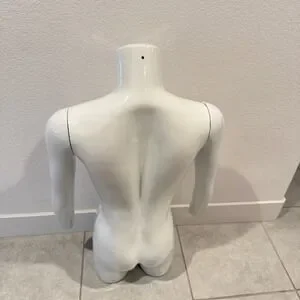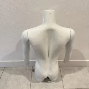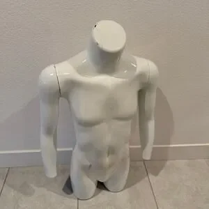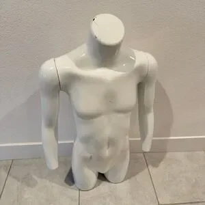 Showcase your apparel with this striking white male torso mannequin. Its realistic anatomical details create an engaging display that draws the eye, allowing customers to visualize garments beautifully. The smooth, glossy finish reflects light, making your clothing pop and enhancing its appeal. Built for durability, this form is perfect for a retail environment or for a home collector looking to present garments with professional flair. Ideal for boutiques, pop-up shops, or even for photographers seeking to add a polished touch to product shots.