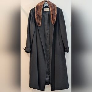 Vintage Thalhimer’s black wool swing coat featuring a plush natural fur collar.