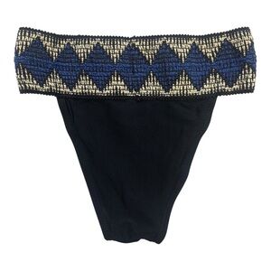 black bikini bottom with a fold-over waistband featuring a blue, white, and black geometric (diamond/boho) pattern.