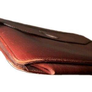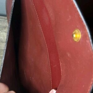 100% authentic vintage Cartier leather clutch bag. Logo in front. Envelop style. Inside has 2 large open pockets. It measures approximately 10 1/8" wide x 7 3/5" high x 2 1/8" in diameter. Unisex. Fully lined with leather and fabric inside. Zipper closure. Shows signs of wear mainly lots of leather peeling inside of bag, rubs on corner/edges and scratches outside of bag. No holes, rips or stains. Bordeaux red color, medium size
