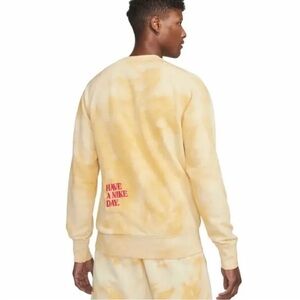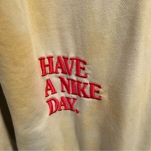 Stylish yellow crewneck sweater. Features floral detail and Nike logo. Comfortable and trendy.