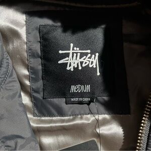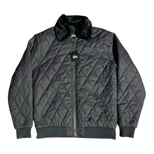 Stussy Quilted Bomber Jacket Faux Fur Collar Gray Black