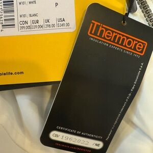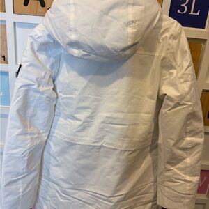 Stylish white parka with a hood. Features front zipper and pockets. Perfect for cold weather.