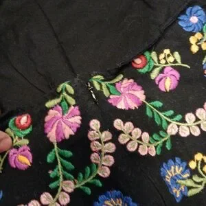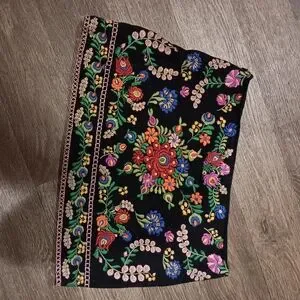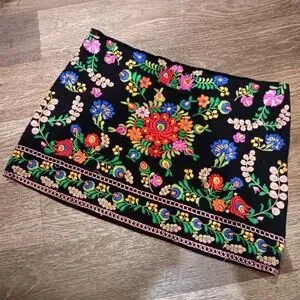 Vibrant floral embroidery on a black mini skirt. Eye-catching design. Perfect for a stylish look. Length 14 inches