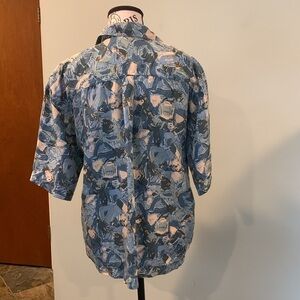 Vintage 80s Stunt Blue Patterned Boxy Silk Button-Up Shirt Blouse Women’s Medium