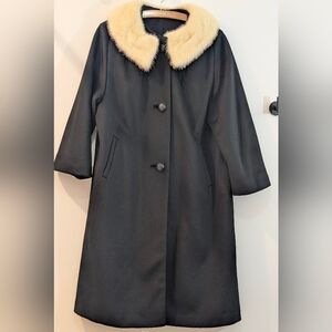 Vintage black wool coat with a luxe cream mink fur collar and classic mid-century silhouette. This piece has unmistakable Jackie O elegance — structured, timeless, and beautifully made.