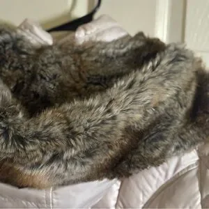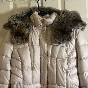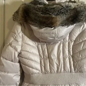 Chic ivory puffer jacket. Features stylish faux fur accents. Ideal for cold weather.