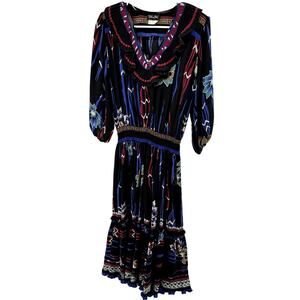 VTG Diane Freis Georgette Maxi Dress V Neck Ruffle Floral Smocked Multicolor XL