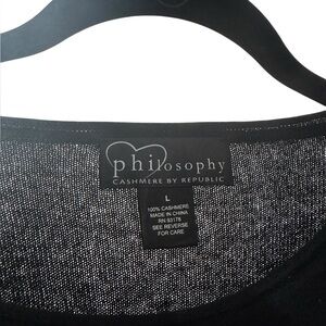 The Philosophy by Republic 100% Cashmere Asymmetrical Black Pullover in size Large is a luxurious and versatile sweater perfect for various occasions. Made with high-quality cashmere material, this pullover features a round neck, long sleeves with raglan sleeves, and a solid black color. Its lightweight and breathable design make it suitable for winter, fall, and spring seasons. Whether for a party, casual outing, workwear, or business setting, this philosophical sweater from the reputable brand Philosophy is a standout piece in any woman's wardrobe.
