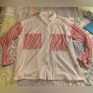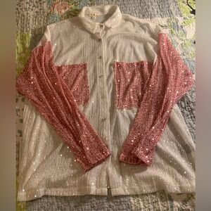 Very good used condition, oversized . This shiny sequin blouse is perfect for a fun Galentine's Day or hitting Broadway! Those sequins catch the light perfectly and we love that classic fit. You can style this fun button down with jeans, skirts, or shorts! This blouse features long sleeves, a collared neckline, button down front closure, breast pockets, and is fully sequined.