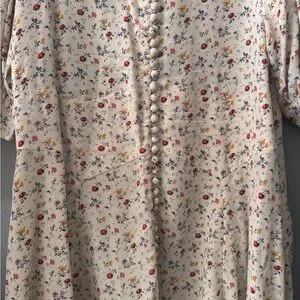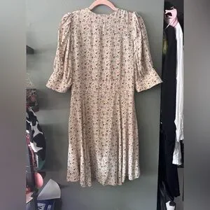 Charming cream dress with floral pattern. Features a deep V-neck and puff sleeves. Perfect for casual outings.
