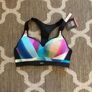 Victoria’s Secret sports bra. This is the incredible sports bra by Victoria’s Secret size 34B maximum support cushion adjustable back closure fully adjustable straps. The color is Monty color pink blue green yellow tag. See pictures for more details.