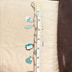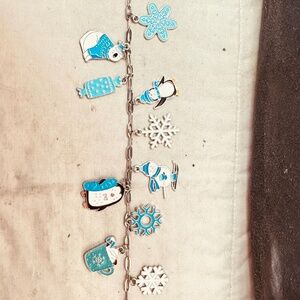 Handcrafted charm bracelet featuring a playful winter-themed enamel charm collection in soft blue, teal, white, & silver tones. Bracelet includes cozy seasonal designs such as snowmen, penguins, snowflakes, polar bear, hot cocoa in mug, & winter candy creating a cheerful and nostalgic cold-weather vibe.