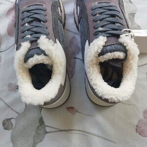Suede and wool blend, dark gray laces, embellished with small rhinestones on the side.