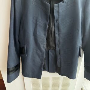 Stylish navy blazer with black detailing. Features buttoned epaulettes and sleek design. Ideal for a chic, modern look.