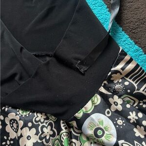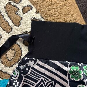 Stylish women's skirt featuring a vibrant floral pattern in black and green. Perfect for adding a touch of elegance to any outfit. Some peeling/wear pictured on the waistband but never ruined the fit for me :) No tag so size (medium) is approximate plz see measurements in pictures- waistband is stretchy so could probs fit small-large depending on where you prefer it to sit hip wise