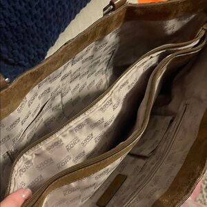 Stylish brown tote bag crafted from suede and leather. Perfect for everyday use with a chic design. Internal pocket for laptops. Very well loved but still a very very sharp piece. See photos for wear