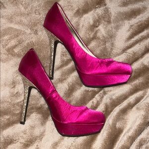 Elegant fuchsia satin heels with a sparkling gold stiletto. Perfect for glamorous events. Only slight wear on the soul. Barely used.