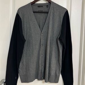 Stylish two-tone cardigan in gray and black by ATM Anthony Thomas Melillo, men’s size Large. Made from a luxurious blend of 92% cotton and 8% cashmere for a soft, lightweight feel. Features a V-neck, button front, and long sleeves. Subtle “ATM” logo embroidered on the left sleeve.