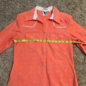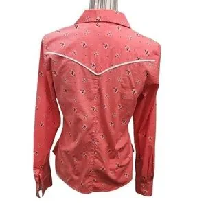 Authentic vintage Rockies women's western shirt featuring a beautiful coral bandana-style print throughout. Designed with classic pearl snap buttons, pointed yoke detailing, and dual snap-flap chest pockets for timeless cowgirl charm. Crafted from a comfortable cotton blend with a touch of stretch for an easy, flattering fit. Perfect for Western wear lovers, festival outfits, rodeo style, or casual everyday denim pairings.