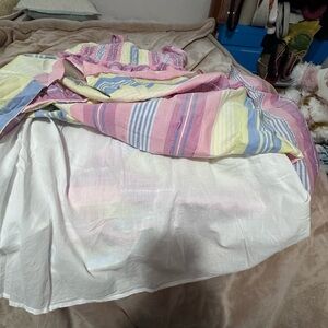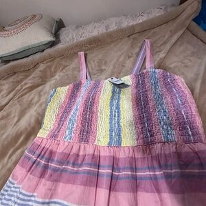 Vibrant dress with multicolor stripes. Features pink, yellow, and blue tones. Ideal for casual outings. 100% cotton. Lined with cotton slip. Pullover style. Very stretchy with a smocked bodice.