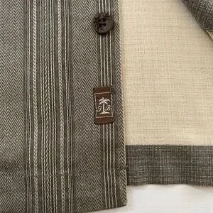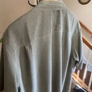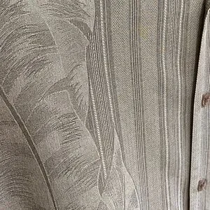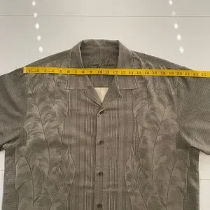 This shirts was produced in a dark green khaki (near to Army Green) color with embossed palm trees. We removed the tiny label with size and material composition but the shirty is 100% Silk.