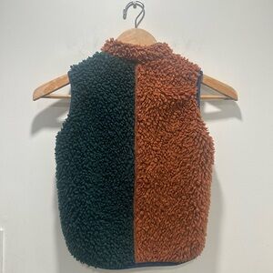 Cozy fleece vest for kids. Stylish brown and teal design. Perfect for outdoor fun.