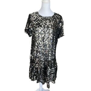 New , never worn, drop waist dress with pleats on the bottom. Length of dress is 34 I’m he’s, is 16 inches armpit to armpit lying flat and sleeves are 8 inches long. Back zipper closure. Dress is black and silver sequins