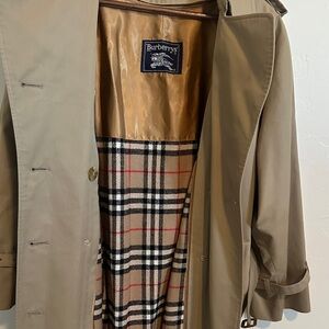 Classic Burberry trench coat. Features iconic check lining. Belted waist. Timeless design.