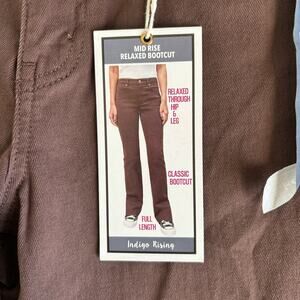 Features: Indigo Rising Women’s Brown Raw Hemline Mid Rise Relaxed Bootcut Jeans; relaxed through the hips and legs, classic bootcut, full length. 98% cotton, 2% spandex.