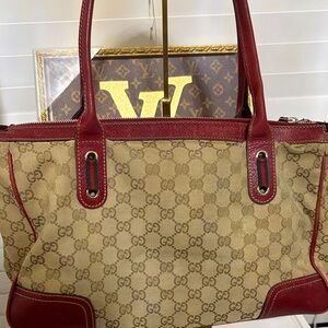 Elegant Authentic Gucci tote with signature beige pattern. Bold red leather trim enhances style.